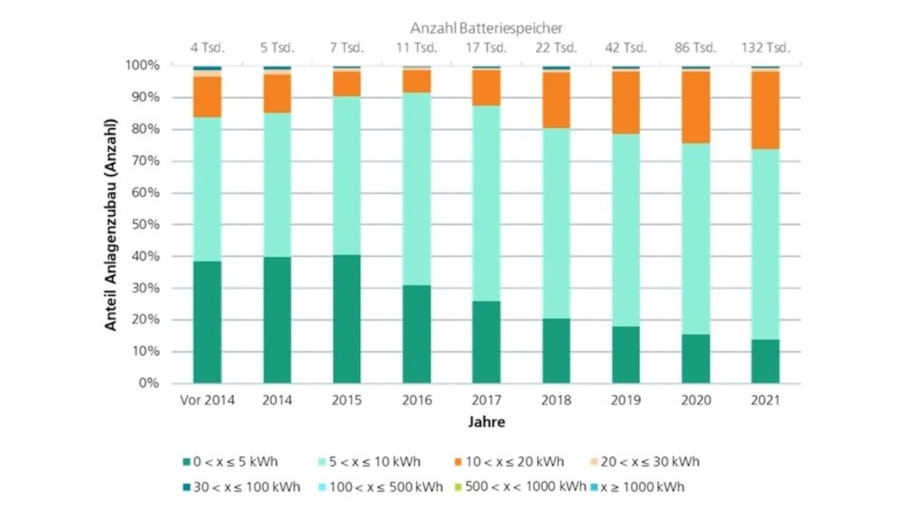 Auch die Leistungsklasse 10 kWh bis 20 kWh baute ihren Anteil am Zubau auf 32,8 Prozent in 2021 aus. Ende 2021 waren 85 Großspeicher mit mehr als 1.000 MWh Kapazität installiert, beim Kapazitätszubau hatten sie zwischen 2014 und 2021 einen Anteil von durchschnittlich 26,8 Prozent. Andere Leistungsklassen spielen kaum eine Rolle.