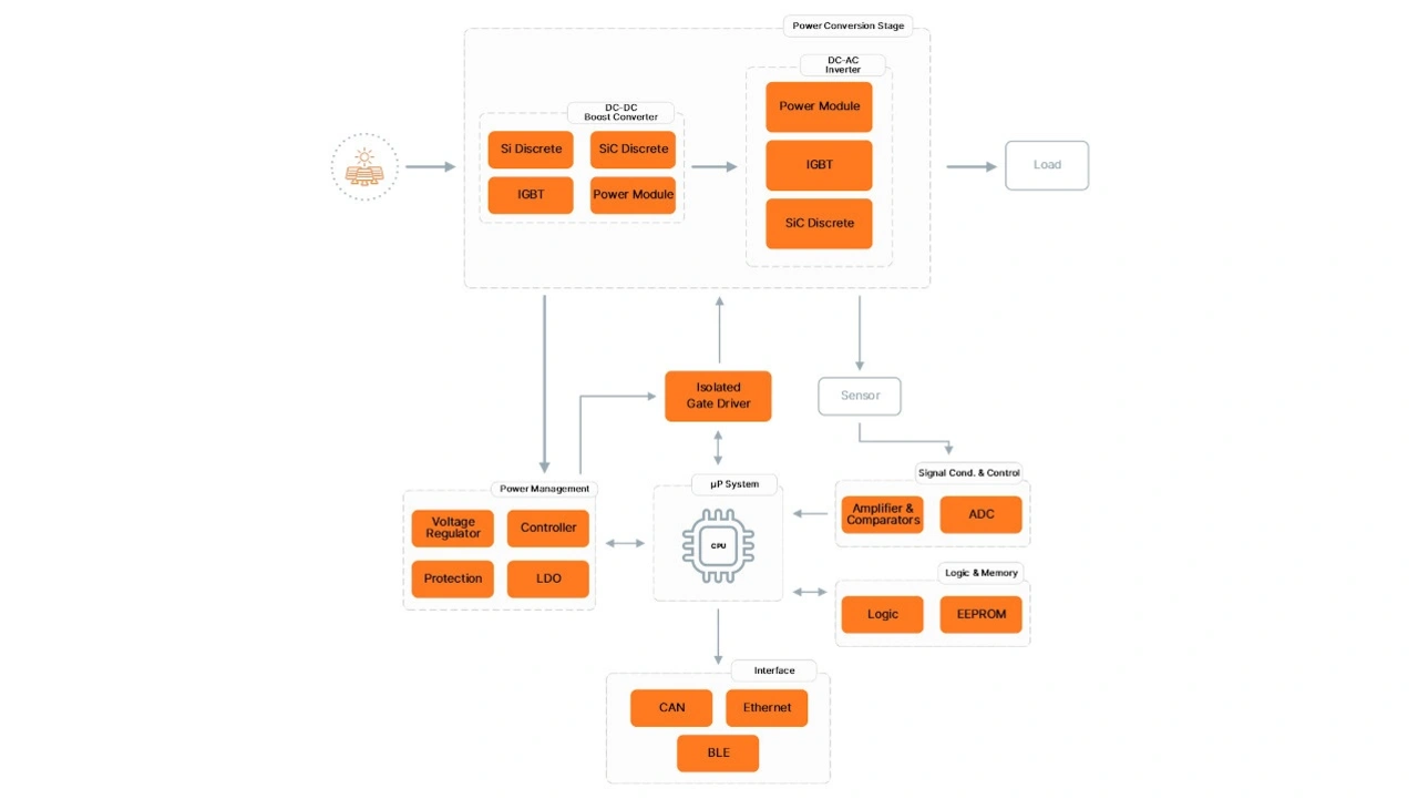 Eine Solaranlage für Privathaushalte besteht aus einem Solarwechselrichter und den Solarzellen beziehungsweise Photovoltaikmodulen (PV), die eine variable Gleichspannung erzeugen. Ein DC/DC-Boost-/Aufwärtswandler erhöht diese Spannung auf ein Betriebsniveau für den DC-Zwischenkreis. Dabei kommt Maximum Power Point Tracking (MPPT) zum Einsatz, um die eingefangene Energie je nach Stärke und Richtung des Sonnenlichts während des Tages zu optimieren.
