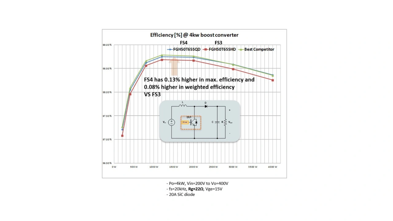 Ein dünnerer IGBT-Chip trägt zu einem geringeren Wärmewiderstand bei, und die schmale Mesa erhöht die Leistungsdichte, so dass der gleiche Strom-IGBT in einem kleineren Gehäuse untergebracht werden kann. Das FS4-IGBT-Design bietet einen höheren Wirkungsgrad bei geringer Last in einem 4-kW-Aufwärtswandler (Bild 4) als ein Wandler mit FS3-Design, und seine Leistungsfähigkeit entspricht der anderer konkurrierender Bauelemente.