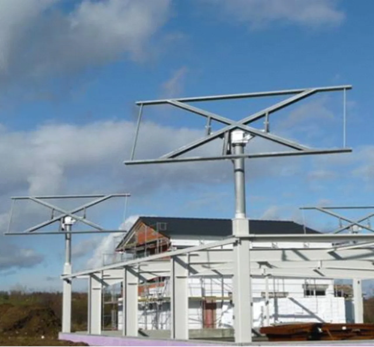 An den vier Ecken des 20 auf 25 Meter großen und 4,20 hohen Gebäudes wurden massive Rohrstützen eingebaut, jede mit einer Wandstärke von 12,5 Millimetern und einer Fläche von 40 mal 40 Zentimetern. Insgesamt wurden etwa 20,5 Tonnen Stahl in der Lagerhalle verbaut, wobei die Stützkonstruktion für die Solaranlage den Löwenanteil ausmacht. Die Stahlpfeiler sollen die auf die Solarpaneele wirkenden Kräfte ableiten. Dazu tragen sie an der Spitze eine angeschweißte Kopfplatte, auf die die Tracker montiert sind.