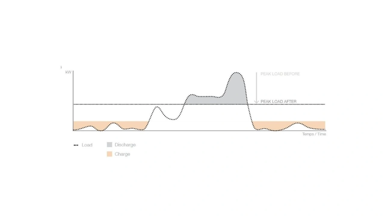 Die Integration von Energiespeichersystemen kann dazu beitragen, den höchsten Strombedarf durch Laststeuerung zu kappen. Diese Technologie wird als Lastspitzenkappung oder auch Peak Shaving bezeichnet. Auf diese Weise werden die normalerweise durch das Netz abgedeckten Bedarfsspitzen vom System aufgefangen. Die Batterien des Speichersystems werden dann geladen, wenn der Ladebedarf für Elektrofahrzeuge sinkt, und entladen, wenn der Strombedarf zu steigen beginnt. Dies senkt die Kosten des Strombezugs.