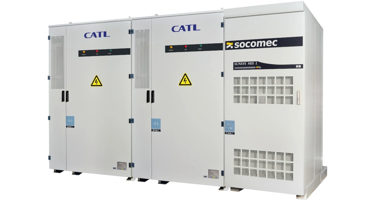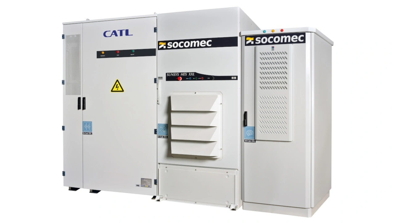 Für den optimalen Betrieb von Ladeinfrastrukturen für Elektrofahrzeuge hat der Hersteller Socomec die passenden Energiespeichersysteme: Sunsys HES L und Sunsys HES XXL.