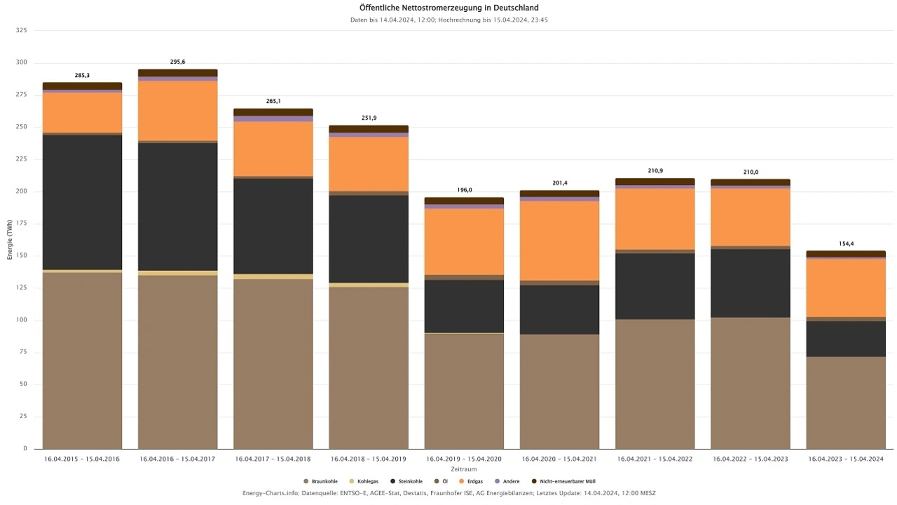 Parallel zur gestiegenen Erzeugung aus erneuerbaren ist die Stromerzeugung aus fossilen Energien zurückgegangen. Im ersten Jahr ohne Kernenergie wurden ungefähr 154,4 TWh Strom aus Kohle, Erdgas, Öl und Müll erzeugt. Das liegt deutlich unter den Werten der Vorjahre und 26 Prozent unter dem Vorjahreszeitraum.