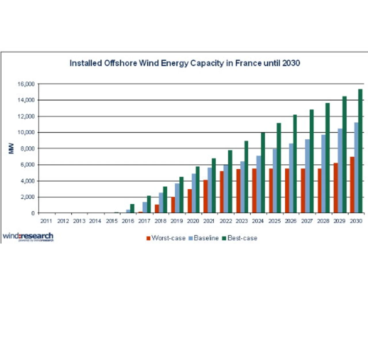 Wegen dieser Unsicherheiten verlangsamt sich das Wachstum des Marktvolumens im Referenzszenario von wind:research. Neben den beiden Einflussfaktoren ist aber auch der Fortschritt hinsichtlich schwimmender Fundamente zu berücksichtigen, die zwar in der Errichtung teurer sind als am Meeresgrund fixierte Anlagen, aber enormes Potenzial für die Installation von Anlagen an der französischen Südküste im Mittelmeer und Atlantik bieten. Insgesamt geht das Referenzszenario von einer installierten Leistung von rund 11 GW im Jahr 2030 aus.
