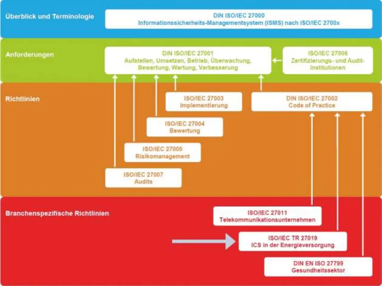 Die derzeit wichtigste internationale Norm für den Umgang mit dokumentierten Informationssicherheits-Management-Systemen ist die ISO-Normenreihe 27000. Speziell die ISO/IEC TR 27019 »Information security management guidelines based on ISO/IEC 27002 for process control systems specific to the energy market« konkretisiert und ergänzt die ISO-27002-Anforderungen für die Prozessdatenverarbeitung bei Energieversorgern. Die Technische Richtlinie ging aus der deutschen Initiative DIN SPEC 27009 »Leitfaden für das Informationssicherheits-Management von Steuerungssystemen der Energieversorgung auf Grundlage der ISO/IEC 27002« hervor.