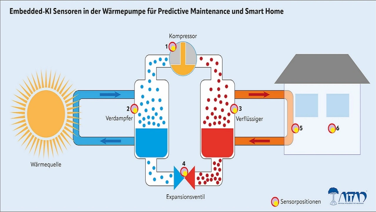 Auf der Technologieseite bietet sich der Einsatz intelligenter Sensoren (Embedded-KI-Systemkomponenten) an, bei denen die KI direkt auf dem Sensorboard untergebracht ist und die Überwachung der Wärmepumpe auch ohne Internet- oder Cloudverbindung erfolgen kann. Embedded-KI hat zudem den großen Vorteil, dass sie viel größere Datenmengen (bis zu mehreren Terabyte täglich) verarbeitet, was mit herkömmlichen Cloud- oder Serverlösungen nicht möglich ist, da solch große Datenmengen kaum übertragbar sind.
