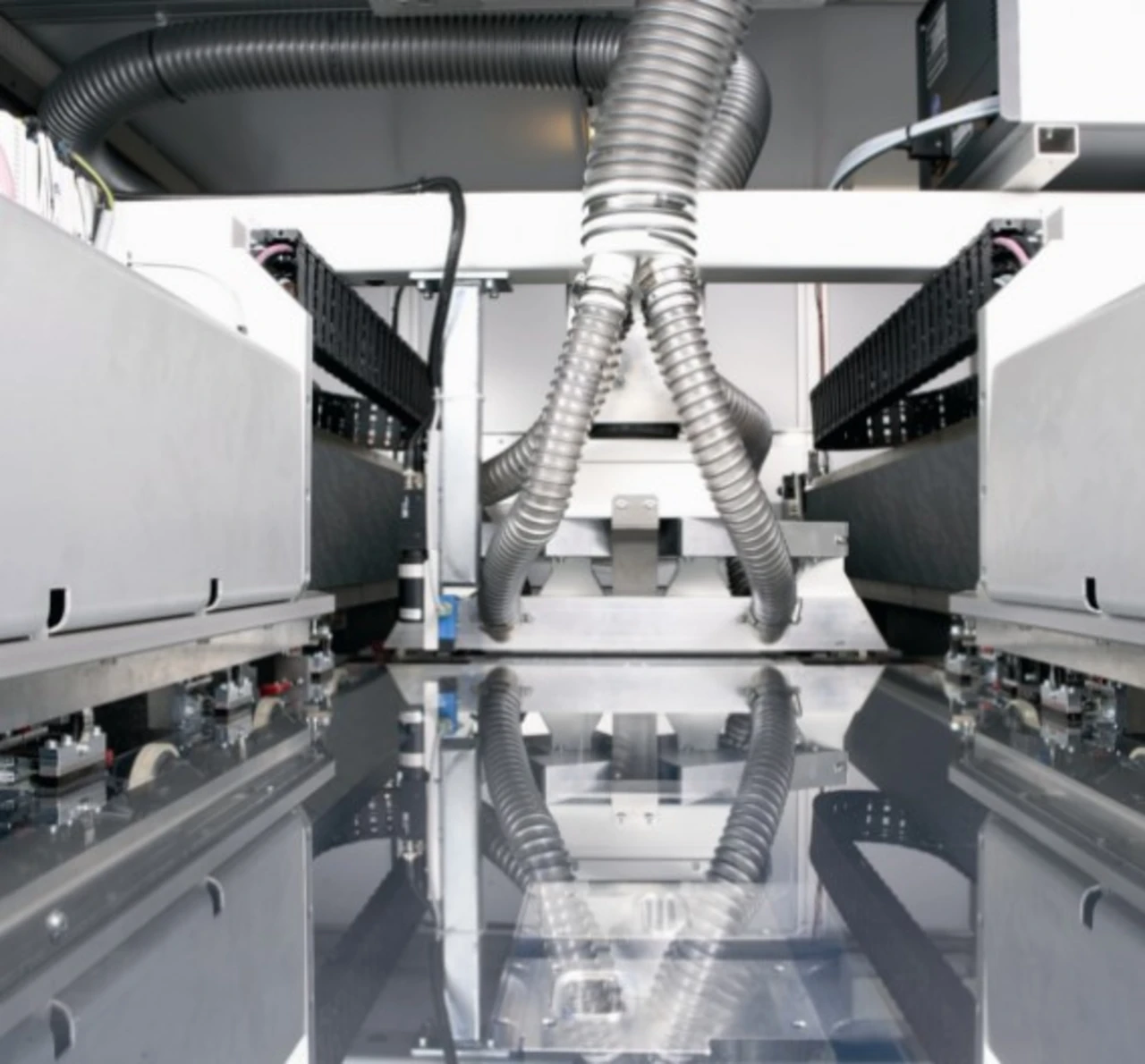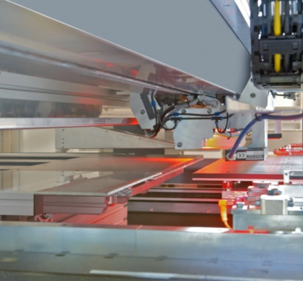 Für die Strukturierung eines Dünnschicht-Moduls sind drei Laserdurchgänge erforderlich. »Um eine möglichst hohe Moduleffizienz zu erzielen, müssen wir den gesamten Scribing-Prozess betrachten«, erklärt Hüske. Aus dieser Gesamtbetrachtung zeige sich, so Hüske, dass der Transport des Substrats eine wichtige Rolle spielt. Der einfachste Weg wäre, das Substrat unter einem feststehenden Laserkopf »durchlaufen« zu lassen. »Dieser eigentlich nahe liegende Ansatz führt aber zu einer geringen Scribing-Leistung«, weiß Hüske. Außerdem beeinträchtigen mögliche Vibrationen die Strukturierung. Bessere Ergebnisse lassen sich nach Erfahrung von LPKF dadurch erzielen, indem nicht das Substrat, sondern der Laserkopf bewegt wird. Denn der Laserkopf hat eine geringe von der Glasgröße unabhängige Masse und lässt sich daher schnell beschleunigen. LPKF SolarQuipment setzt deshalb im Laser-Scriber LPKF Allegro auf ein Portal-System, das den Laserkopf und dessen Portalachse präzise und dynamisch unter dem stehenden Glassubstrat bewegt. Der Mehrstrahlkopf mit automatischer Strahlverstellung für Zellbreiten zwischen 5 und 15 Millimetern bewegt sich mit bis zu 2 m/s und kann mit 2 G beschleunigen. Greifer halten das Glassubstrat an zwei gegenüberliegenden Seiten und bewegen es nach dem Strukturieren um eine Kopfbreite weiter. Je nach Substratgröße liegen die Bearbeitungszeiten des Strukturierens bei unter einer Sekunde für mehrere Zellen gleichzeitig. Der Glasvorschub und das Laser-Scribing lösen sich ab, bis das Modul vollständig bearbeitet ist und in den nächsten Produktionsschritt gelangt.