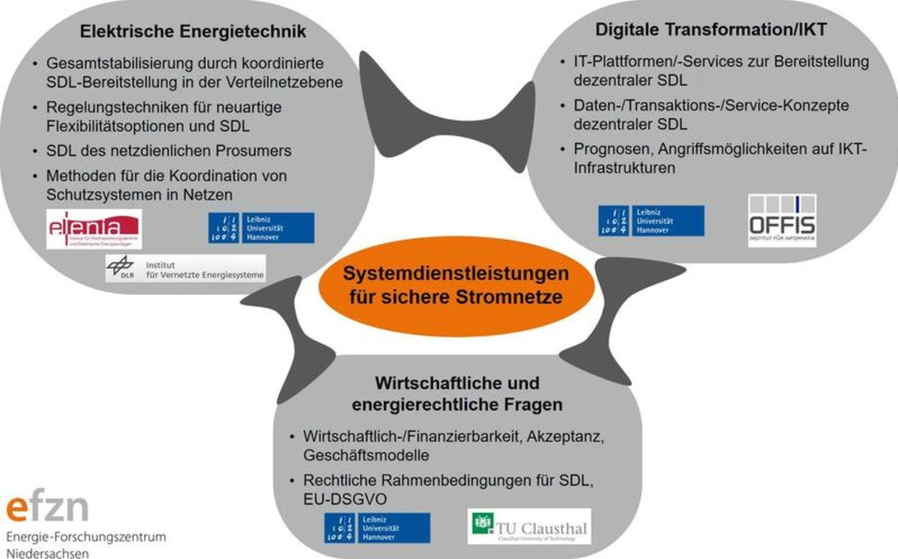 Das interdisziplinäre Projekt wird an den vier EFZN-Forschungsstandorten Braunschweig, Clausthal, Hannover und Oldenburg durchgeführt. Die Koordination erfolgt durch das Institut für Hochspannungstechnik und Elektrische Energieanlagen – elenia der TU Braunschweig. Die veränderte Bereitstellung von Systemdienstleistungen unterliegt dem Kompetenzbereich „Elektrische Energietechnik“, sichere Kommunikationsansätze werden im Bereich „Digitale Transformation / Informations- und Kommunikationstechnologie (IKT)“ entwickelt. Der Kompetenzbereich „Wirtschaftliche und energierechtliche Fragen“ identifiziert wirtschaftliche Optimierungspotentiale bei der Bereitstellung von Systemdienstleistungen und untersucht nötige rechtliche Anpassungen. Weitere Informationen zum Forschungsprojekt sind online erhältlich.