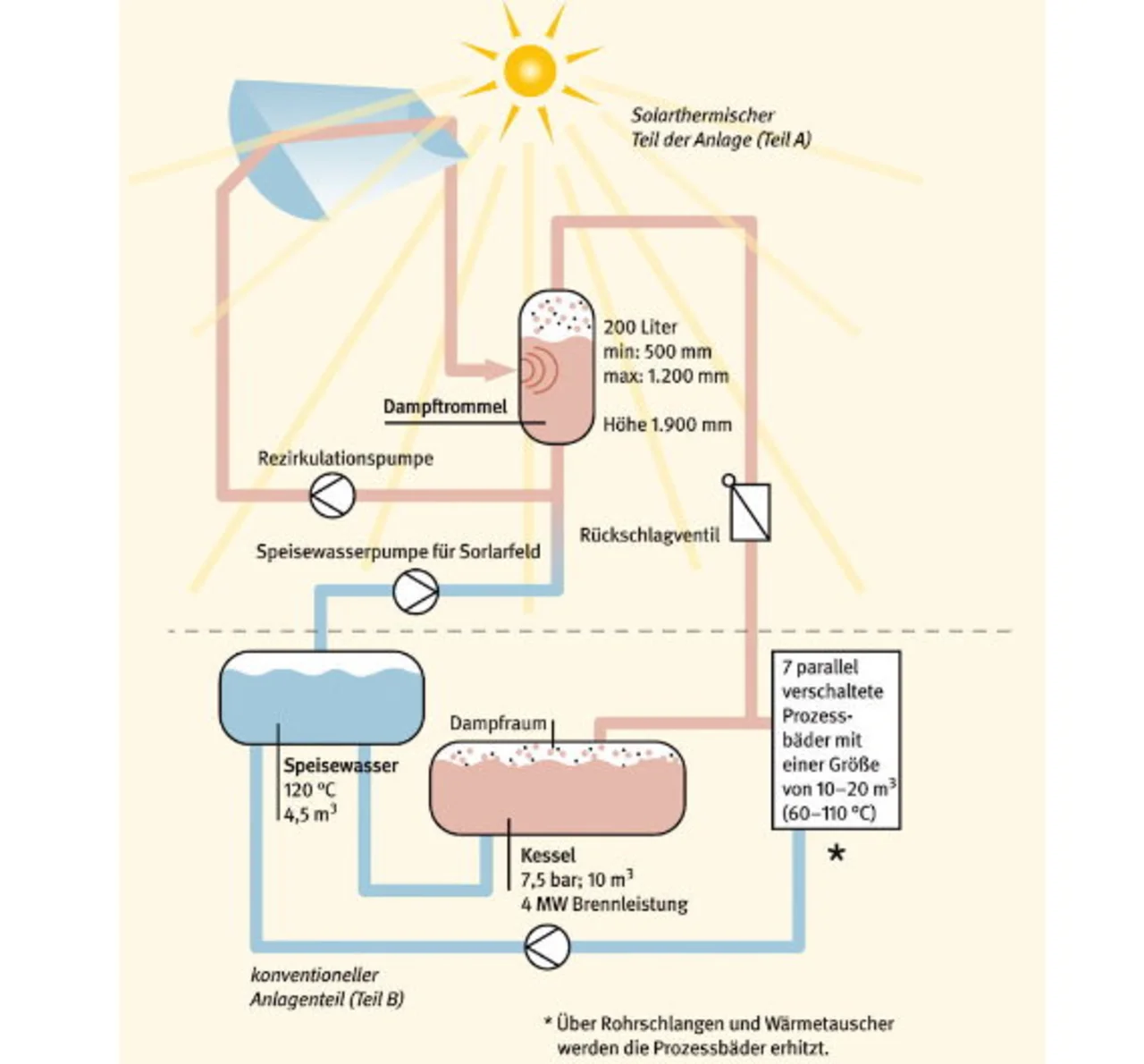 Einachsig nachgeführte Parabolrinnenkollektoren sind gebogene Spiegel, die das Sonnenlicht auf eine Brennlinie konzentrieren. Dort verlaufen Absorberrohre, die die Sonnenstrahlen in Wärme umsetzen. Eine Pumpe leitet Wasser aus der Dampftrommel solange durch die Absorberrohre, bis die notwendige Temperatur und ausreichend Druck entstehen, um ein Rückschlagventil zur Dampfschiene der Produktion zu öffnen. Dafür ist in der Trommel ein Niveau zwischen 500 und 1200 mm notwendig. Um das zu erhalten, wird Speisewasser aus der Produktions-Dampfkesselanlage nachgeführt.
