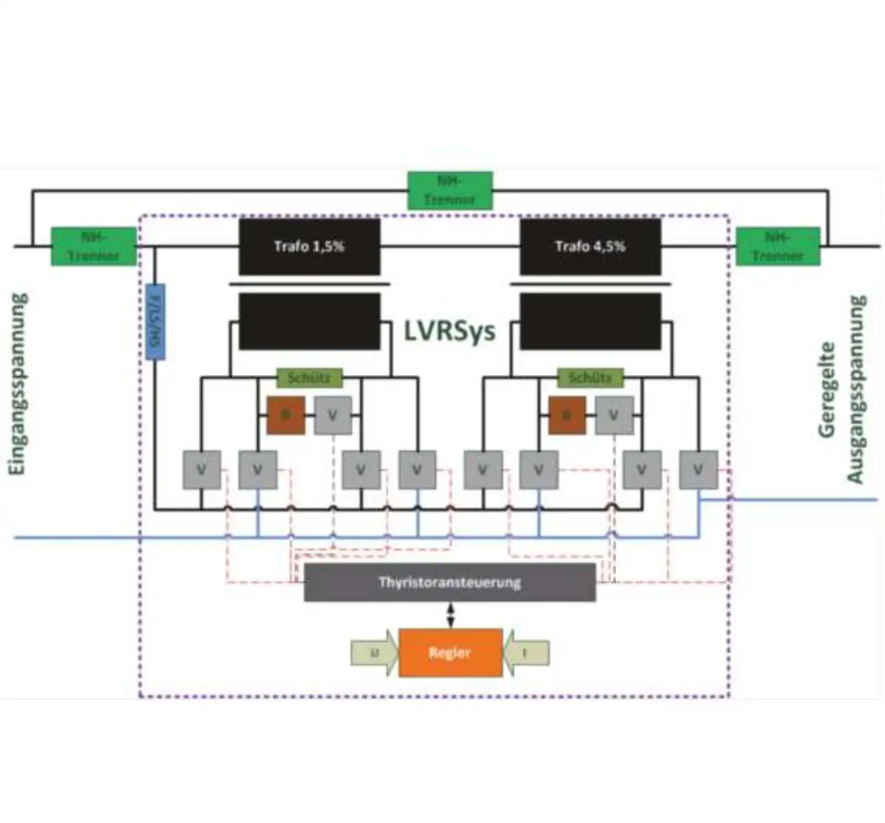 Verlustarme Transformatoren werden seriell in das Netz eingeschliffen. Mit Hilfe von robusten Leistungshalbleitern, werden die Transformatoren angesteuert. Es ergibt sich ein Regelbereich von ±6 Prozent in 1,5%-Schritten. Die Nachrüstung des Regelsystems ist bei einem Leistungsbereich von 50 kVA bis 1000 kVA möglich, so der Hersteller. Das RONT-System testet A. Eberle derzeit im eigenen Betrieb sowie in mehreren Testanlagen bei Verteilnetzbetreibern.