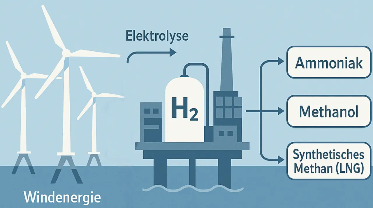 Vor Helgoland erprobt ein Forschungsteam eine schwimmende Plattform, die mit Windkraft synthetische Kraftstoffe wie Wasserstoff, Methanol oder Ammoniak direkt auf See erzeugen soll.