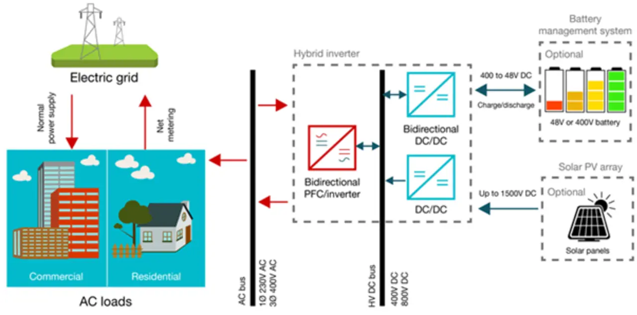 Ein Hybrid-Wechselrichter verhilft den Umwandlungsstufen zu einem höheren Wirkungsgrad, und dies wiederum ist in einem Mikronetz mit integriertem ESS von großer Bedeutung, weil hier mehrere Umwandlungen erfolgen. Leistungswandler-Systeme nutzen DC/DC-Wandler zum Laden und Entladen der Batterien sowie DC/AC- und AC/DC-Stufen zum Rückspeisen der in der Batterie gespeicherten Energie in das Netz und umgekehrt.