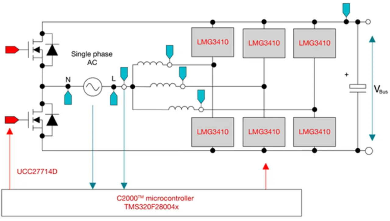 Ein Referenzdesign für eine bidirektionale, GaN-basierte PFC-Stufe mit CCM-Totem-Pole-Architektur und hoher Leistungsdichte auf Basis eines C2000-Mikrocontrollers enthält eine bidirektionale, brückenlose Totem-Pole-PFC-Stufe, die mit einer Echtzeit-MCU der Reihe C2000 und einem GaN-FET des Typs LMG3410R070 mit integrierten Treiber- und Schutzfunktionen bestückt ist (Bild 3). Das bidirektionale Design mit einer Leistung von 3 kW unterstützt das Phase Shedding und eine adaptive Totzeit, um den Wirkungsgrad anzuheben. Eine nichtlineare Spannungs-Regelschleife reduziert außerdem die Entstehung von Spannungsspitzen bei etwaigen Transienten im PFC-Modus.
