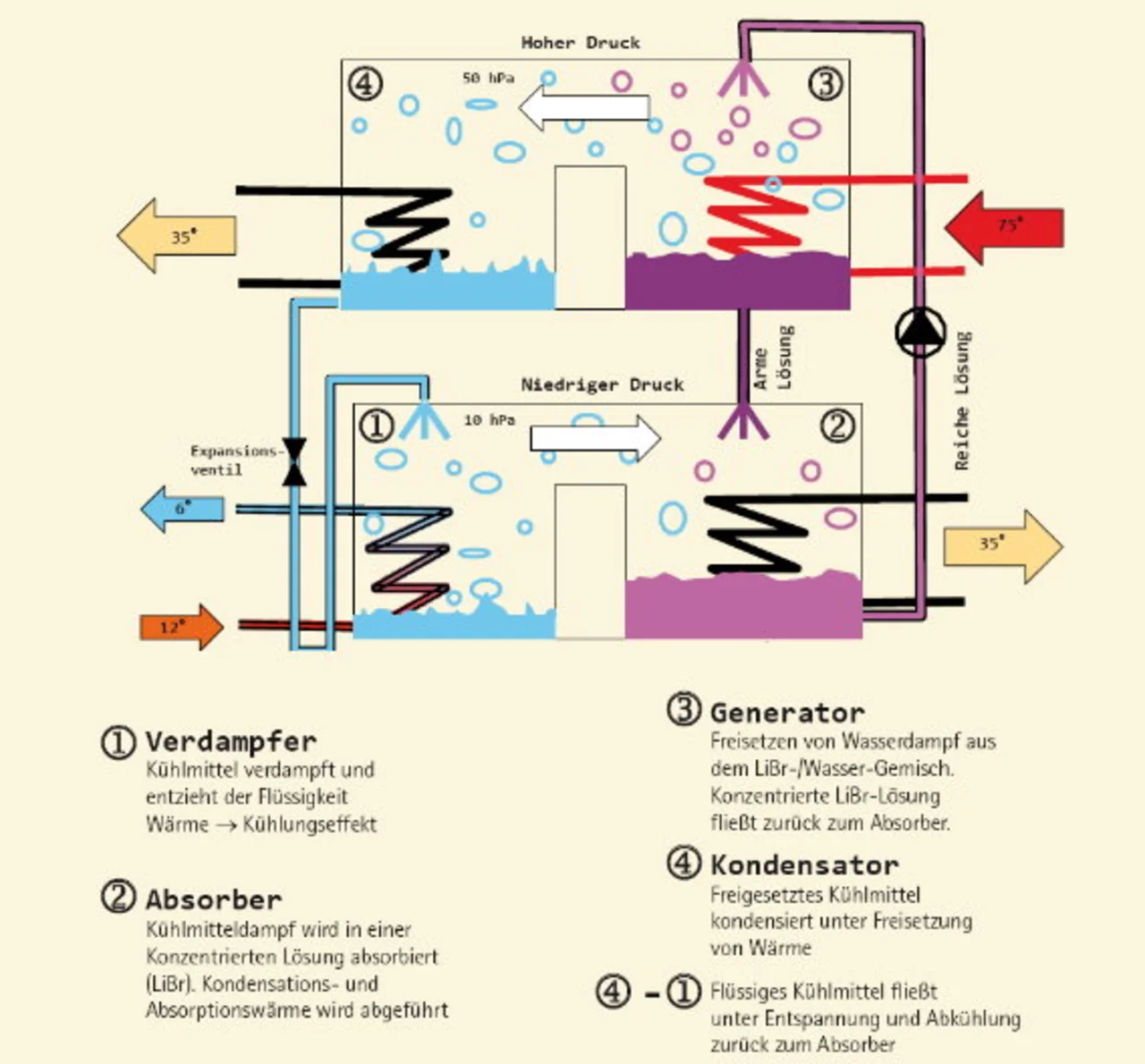 Üblicherweise eingesetzte Kälte-/Lösungsmittelkombinationen sind Wasser/Lithiumbromid oder Ammoniak/Wasser. Vom Absorber gelangt die an Kältemittel reiche Lösung in den Generator, dort wird durch Wärmezufuhr mittels Solaranlage das Kältemittel aufgrund des im Vergleich zum Lösungsmittel niedrigeren Siedepunktes ausgetrieben. Das nun an Kältemittel arme Lösungsmittel fließt dabei in den Absorber zurück.