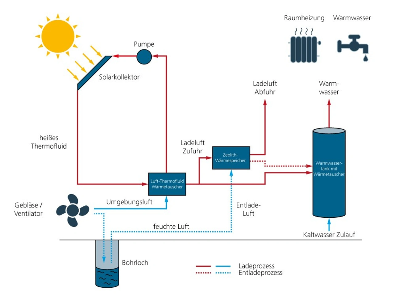 Für den Bereich Wärme übernimmt diese Funktion in vielen Wärmekreisen ein Wasserspeicher. Aber auch hier wird an besseren Speicherkonzepten gearbeitet, die eine höhere Speicherkapazität als Wasser haben und die platzsparender und verlustärmer gestaltet werden können. Darunter fallen zum Beispiel Adsorptionswärmespeicher, bei denen nanoporösem Zeolith-Granulat unter Zufuhr der zu speichernden Wärme Wasser ausgetrieben wird. Das entspricht dann der Beladung des Speichers mit Energie.