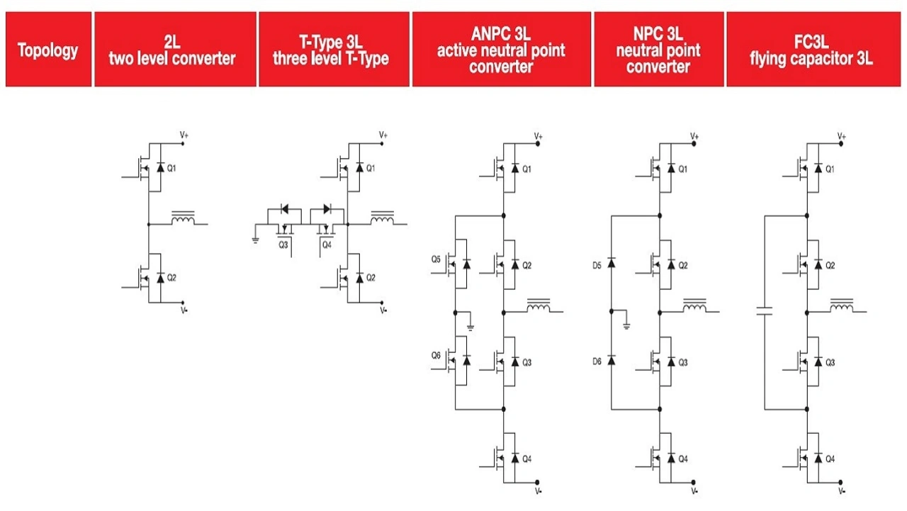 Bestehende Leistungstopologien für AC/DC- und DC/DC-Auf- und Abwärtswandler basieren üblicherweise auf phasenversetzt arbeitenden Halbbrücken oder Wandlerzweigen. Dies kann bei DC/DC-Wandlern zur Leistungssteigerung dienen oder bei AC/DC-Wandlern für den dreiphasigen Betrieb oder die Leistungsfaktor-Korrektur genutzt werden, indem die drei Phasen um jeweils 120° phasenversetzt arbeiten. Bild 3 zeigt die vereinfachten Schaltbilder von fünf Leistungswandler-Topologien.