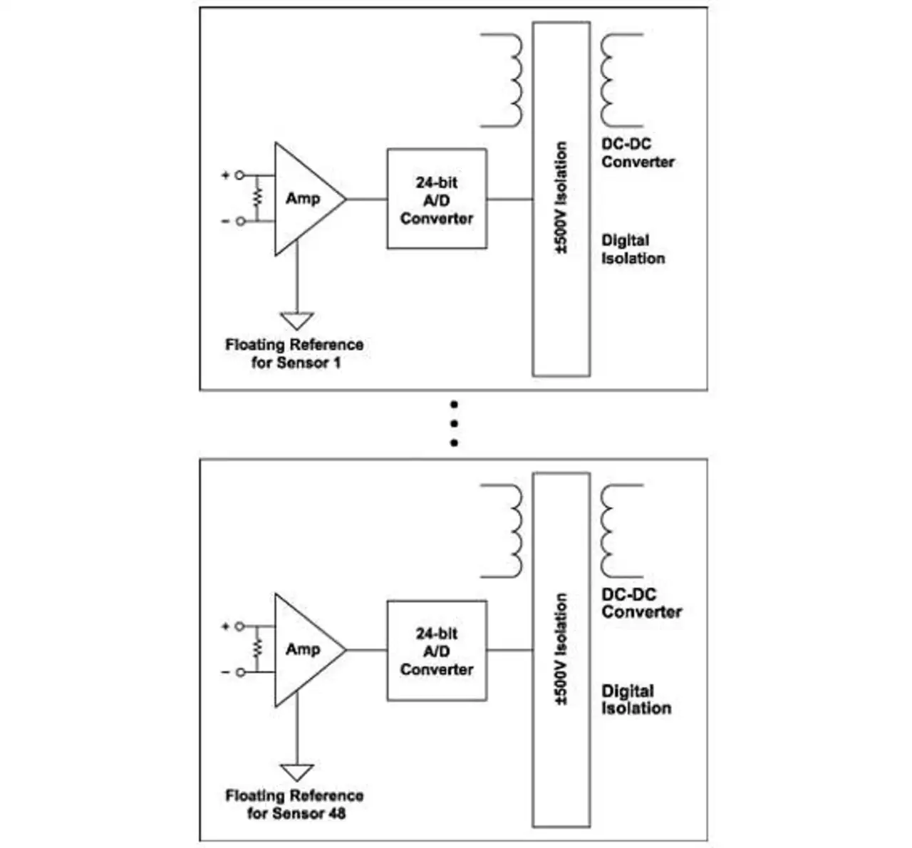 »Systeme mit Eingangs-Multiplexer liefern ein typisches Beispiel für das Messtechnik-Problem, das durch Gleichtaktrauschen oder Masse- bzw. Erdschleifen verursacht wird«, verdeutlicht Gaus. »Hier sind alle analogen Eingänge auf die gemeinsame Masse des Multiplexers bezogen, und das Übersprechen von einem Eingangskanal kann leicht auf einem benachbarten Kanal sichtbar werden. Der Wechsel zu Messgeräten ohne Multiplexer mit je einem dedizierten A/D-Wandler pro Eingangskanal und simultaner Erfassung kann in diesem Fall hilfreich sein. In vielen Situationen dürfte dies jedoch nicht ausreichen.« Einige neuere Systeme arbeiten mit einer Isolation zwischen der Masse des Eingangskanals und der Masse des Computers, um Rauschen und Erdschleifen zu minimieren. Damit lässt sich zwar eine Trennung der Masse des Computers vom analogen Bereich des Messgeräts erreichen, eine echte Isolation zwischen den einzelnen Sensoren existiert aber auch hier nicht.