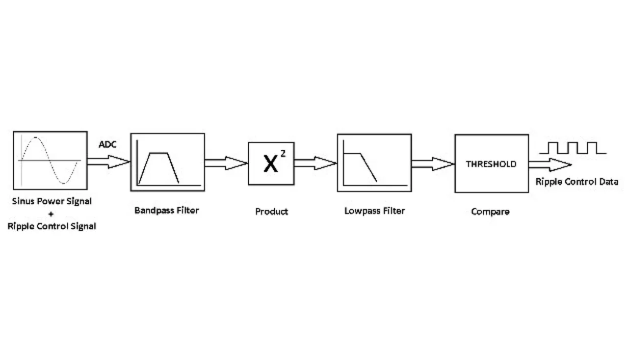 Bild 3 zeigt das in der RCOLIB verwendete Decodierverfahren. Zur Decodierung wird das Rundsteuersignal zunächst aus dem Netz gefiltert. Ein Bandpassfilter separiert das Rundsteuersignal aus der Netzspannung. Anhand des gefilterten Signals kann man sehen, ob ein Rundsteuersignal vorhanden ist. Für die korrekte Decodierung werden einige weitere mathematische Operationen benötigt. Das gefilterte Rundsteuersignal wird durch Potenzierung »gleichgerichtet«. Das gleichgerichtete Signal wird dann durch ein Tiefpassfilter mit niedriger Grenzfrequenz geschickt. Am Ausgang des Tiefpassfilters erhält man den ursprünglichen Signalverlauf. In der letzten Stufe des Decodierprozesses wird der Ausgang des Tiefpassfilters mit einer vordefinierten Schwelle verglichen. Liegt der Ausgangswert des Tiefpassfilters über der Schwelle, so wird ihm bei der Decodierung eine logische 1 zugewiesen, im anderen Falle eine logische 0. Alle diese Schritte sind Bestandteil der RcolibDecode()-Funktion.