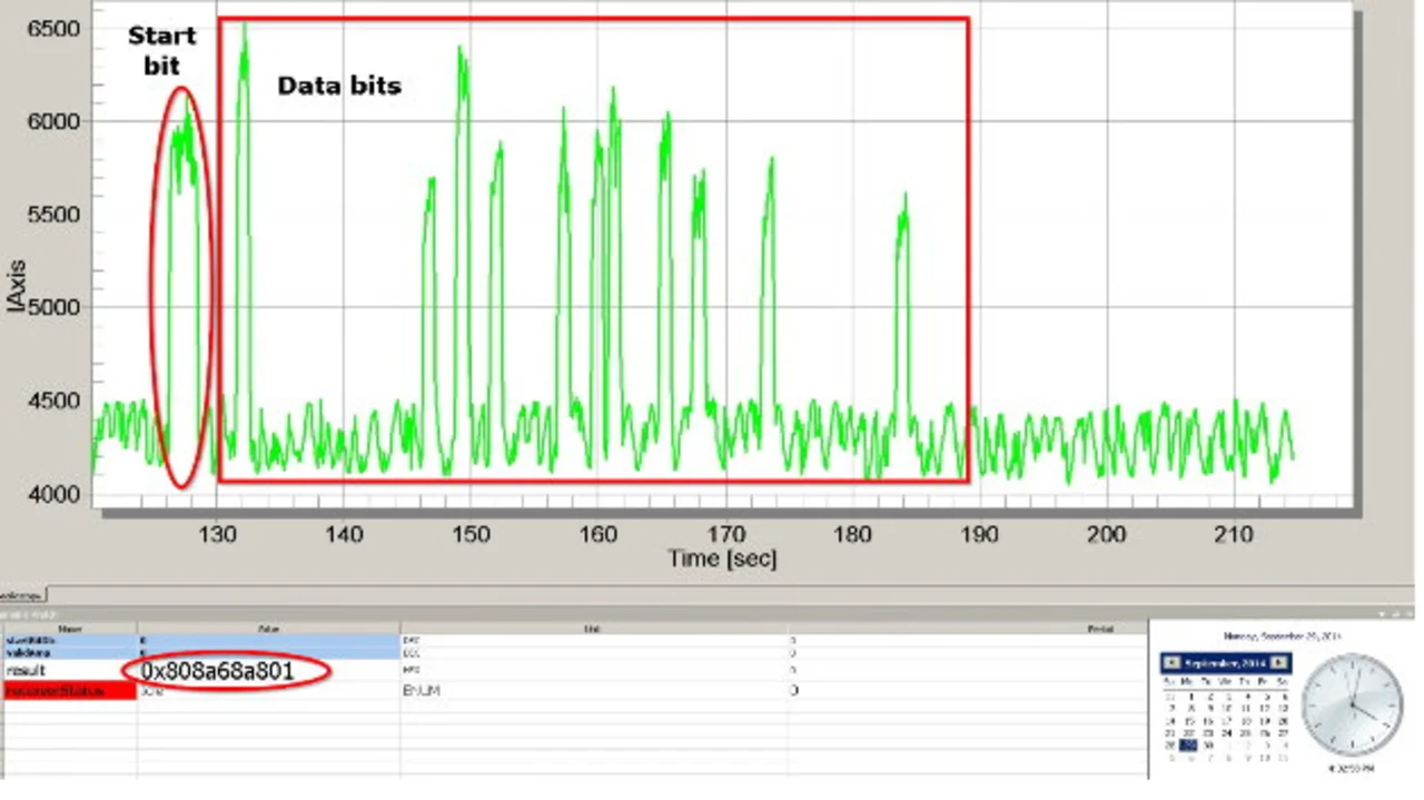 Im Zeitraum von einigen Stunden wurden Dutzende von Rundsteuertelegrammen erfolgreich empfangen. Bild 4 liefert den Beweis für ein erfolgreich empfangenes Rundsteuertelegramm am 29. September 2014 um 16:02 Uhr. Das empfangene Rundsteuertelegramm beginnt mit einem Startbit, auf welches 44 Datenbits folgen. Für eine bessere Lesbarkeit ist das empfangene Rundsteuertelegramm im Hexadezimalformat dargestellt.