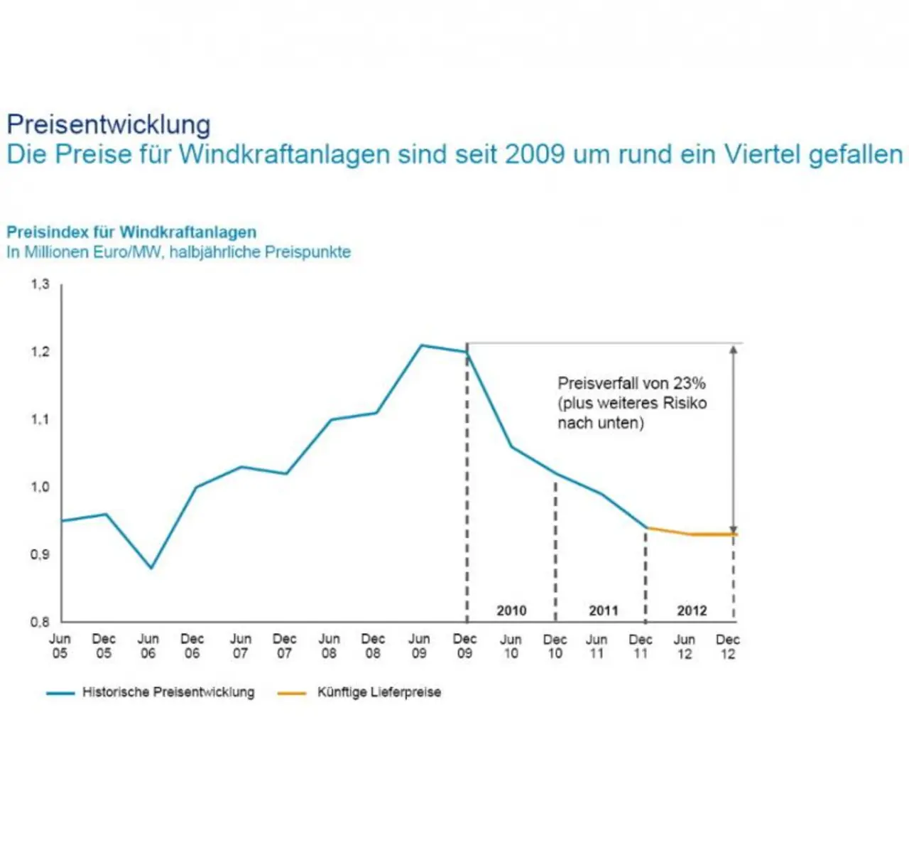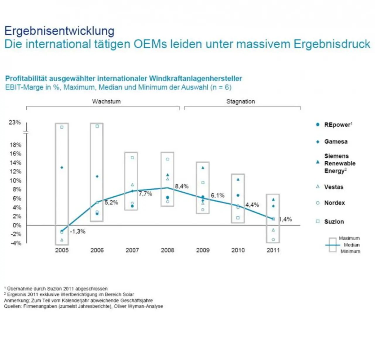 Tatsächlich seien viele internationale Anlagenhersteller im Bereich Wartung und Reparatur bei der Verteidigung ihrer Marktanteile bislang erfolgreicher als erwartet. Allerdings ist heute noch nicht absehbar, ob die vermehrt abgeschlossenen langfristigen Serviceverträge auf Dauer profitabel sind. Der Offshore-Markt bietet zwar hohe prozentuale Wachstumsraten, macht aber heute erst drei Prozent der neu installierten Leistung aus. In absoluten Gigawatt-Zahlen bleibt der Zubau im Onshore-Bereich bis 2020 jedoch größer und wird dann noch über 80 Prozent des Gesamtmarkts ausmachen. Chinesische Wettbewerber bewegen sich zukünftig nicht wie bislang ausschließlich in ihrem Heimatmarkt. Ihr Eintritt in internationale Märkte mit technologisch vergleichbaren, aber günstigeren Produkten, erhöht zusätzlich den Wettbewerbsdruck.
