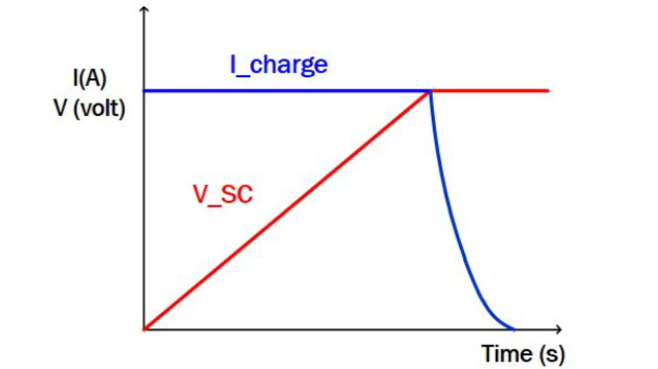Es gibt unterschiedliche Methoden, um einen SC aufzuladen. Am weitesten verbreitet ist der Einsatz von Konstantstrom/Konstantspannungs-Ladeverfahren (CICV, IU). Es stellt die bevorzugte Methode dar, wie in Abbildung 2 dargestellt (CICV-Kurve). Zu Beginn des Ladezyklus arbeitet der Ladebaustein (SW1) im Konstantstrombetrieb und versorgt den SC mit einem Konstantstrom, so dass dessen Spannung linear ansteigt. Der SC wird bis zu einer Ziel-(oder Schluss-)spannung geladen; bei deren Erreichen wird die Konstantspannungsschleife aktiv und sorgt für eine genaue Regelung, damit der SC-Ladepegel konstant bleibt und dadurch ein Überladen vermieden wird. Auch diese bevorzugte Lösung stellt Anforderungen an die Power-Management-Funktionen, die beachtet werden müssen.