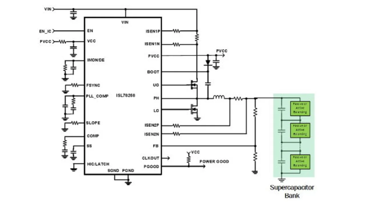 Eine SC-Ladegerät lässt sich mit dem passenden Synchron-Abwärtsregler aufbauen. Abbildung 3 zeigt das vereinfachte Schaltbild des ISL78268 von Intersil, der einen Sync-Buck-Regler ansteuert, um die CICV-Regelung zu erreichen. Zur Aufladung einer Superkondensator-Batterie auf 25 V unter CICV-Regelung arbeitet er mit VIN >= 48 V and VOUT >= 25 V. Er enthält eine Möglichkeit zur Konstantstrom- und Konstantspannungsregelung mit automatischen Übergängen zwischen den Regelbetriebsarten. Außerdem sind genaue Strommesseingänge für den CI-Anteil vorhanden, die über die Versorgungsspannungen des Systems betrieben werden. Wie in Abbildung 3 dargestellt, erfasst der Controller den Dauerstrom des Induktors, als den Ladestrom. Der Strommessverstärker des Controllers muss dabei die Gleichtaktspannung tolerieren, die in diesem Falle 25 V beträgt.