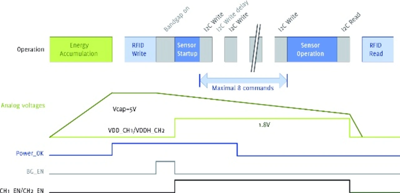Einzigartig am entwickelten Chip ist das flexible Power Management, mit dem eine stabile Kommunikation mit den externen I2C-Sensoren erreicht wird. Es liefert stabile Spannungen nicht nur für die internen Schaltungen, sondern auch für die externen Sensoren. Der Chip nutzt einen externen Kondensator, auf dem automatisch Energie gespeichert wird, während sich der Sensortransponder im Energiefeld des Lesegeräts befindet. Wenn die erforderliche Energie für den System- und Sensorbetrieb erreicht ist, wird ein internes Interrupt-Signal „Power_OK“ initiiert. Ab diesem Zeitpunkt kann der Betrieb der verbundenen I2C-Slave-Chips eingeleitet werden.