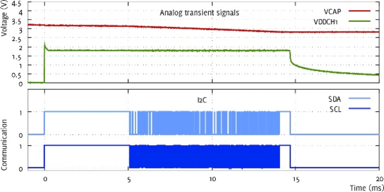 Der RFID-Sensor-Transponder-IC ist in einer 0,18-µm-Standardtechnologie von X-Fab entwickelt worden. Für die Messung und Charakterisierung des entwickelten Chips hat das IMMS eine Evaluierungsplatine mit eingebetteter Antenne entwickelt. Um den Funktionstest des Power Managements und der I2C-Kommunikation durchzuführen, wurde ein kommerzieller I2C-Slave-IC mit dem Transponder-IC verbunden. Der Chip lieferte eine stabile 1,8-V-Spannung für den I2C-Betrieb. Die in Bild 5 dargestellten Messergebnisse bestätigen die Funktionalität des Power Managements und der Kommunikation mit einem externen I2C-Slave-IC.