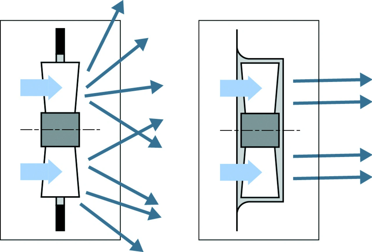 Beim Laufrad ermöglicht die Verbindung einer Aluminium-Trägerstruktur mit einer Hülle aus glasfaserverstärktem Kunststoff eine strömungstechnisch optimierte Form. Im Vergleich mit herkömmlichen Flügeln resultieren eine enorme Geräuschreduzierung und höhere Wirkungsgrade.