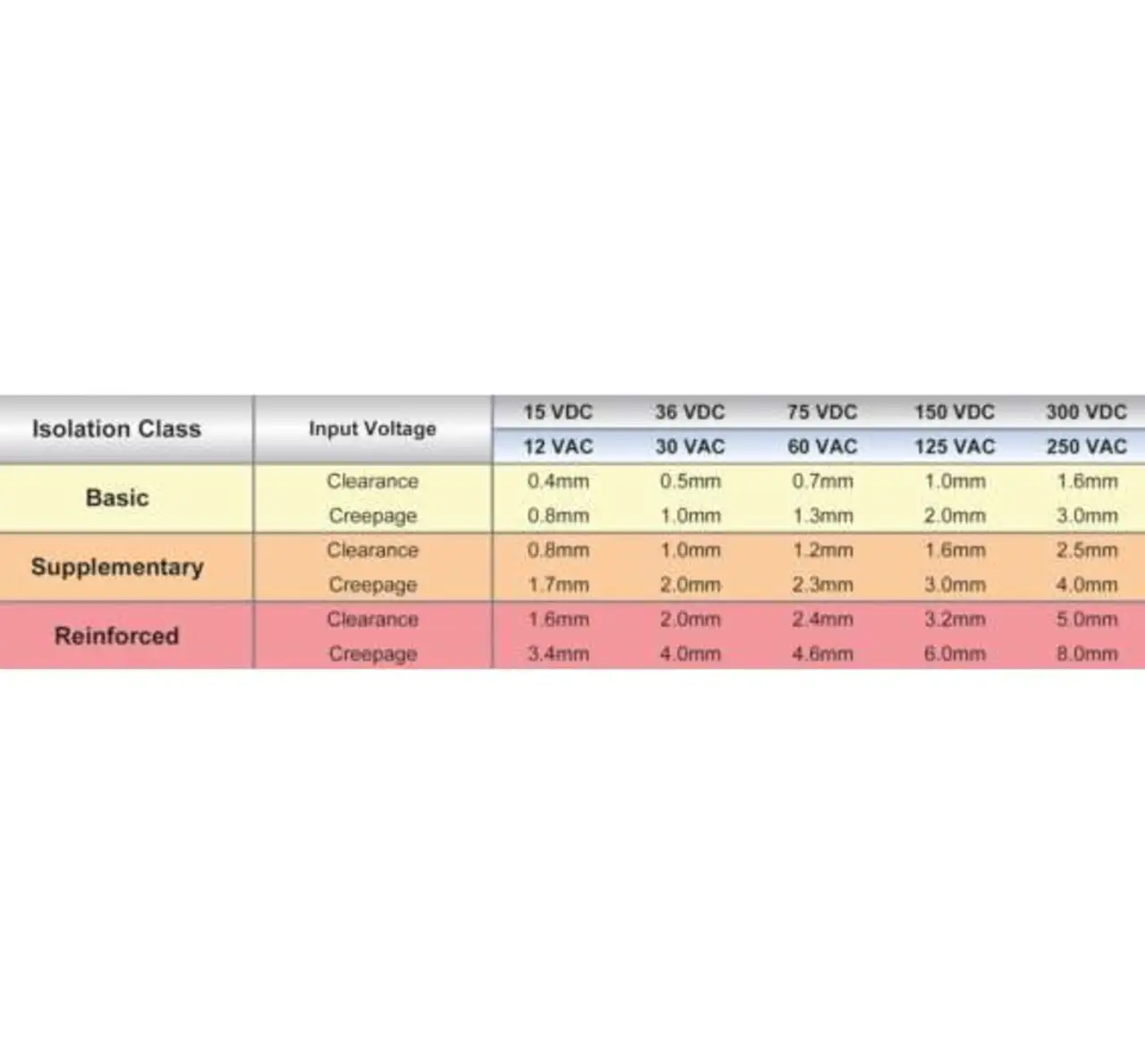 Deshalb hat UL (Underwriters Laboraties) oberhalb dieser »funktionalen« Isolation drei Qualitätsklassen etabliert, für die konkrete Luft- und Kriechstrecken vorgeschrieben sind (Abb.3). In der unteren Klasse »Basic« sind für einen Wandler mit 24 VDC Eingangsspannung Luft- und Kriechstrecken von 0,5 mm bzw. 1,0 mm erforderlich. Bei der Luftstrecke handelt es sich um den direkten »Punkt zu Punkt«-Abstand, bei der Kriechstrecke um den Weg entlang der Oberfläche. Mit auf 1,0 mm bzw. 2,0 mm verdoppelten Werten wartet die Mittelklasse auf - neudeutsch »Supplementary« genannt. Für die Oberklasse mit »reinforced« Isolation sind beim selben Wandler bereits 2,0 mm bzw. 4,0 mm erforderlich - also um den Faktor 4 mehr als bei »Basic«-Isolation.