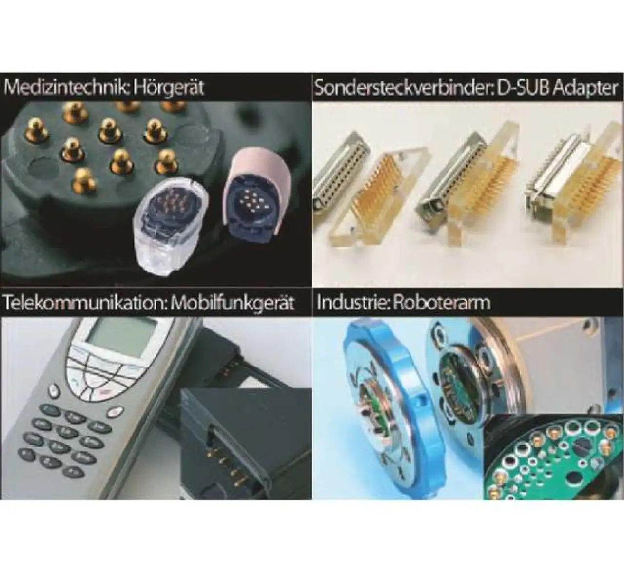 Die Abbildung zeigt aus unterschiedlichsten Industriebereichen exemplarisch einige Applikationen, aus denen hohe Flexibilität, Zuverlässigkeit und Leistungsfähigkeit des gefederten Batteriekontakts gut ersichtlich werden. Im Einzelnen handelt es sich um die Batterieaufnahme eines Mobilfunkgeräts, für die vier Batteriekontakte zur Realisierung der Schnittstelle gewählt wurden, um eine sichere Kontaktierung der Batterie zu gewährleisten. Das Beispiel eines Hörgerätesteckers, mit dem verschiedene Medien an die Haupteinheit des Hörgerätes angebunden werden können, zeigt, wie sich sowohl die langlebige Batterieanbindung als auch eine flexible Datentransferschnittstelle für die Programmierung mit diesen gefederten Batteriekontakten realisieren lassen. Als weiteres Beispiel ist ein Stecker abgebildet, der als Adapter für einen D-SUB-Steckverbinder konzipiert wurde. Der Steckverbinder, der sonst für wenige Steckzyklen ausgelegt ist, kann durch diese Adaptierung mehrere 100.000 Steckzyklen bewältigen. Ebenso ist in der Zusammenstellung eine Schnittstelle auf Basis gefederter Batteriekontakte für einen Roboter zu sehen. Hier werden die Batteriekontakte genutzt, um verschiedene Greifwerkzeuge auf den Roboterarm adaptieren zu können. Die Kontakte haben die Aufgabe, sowohl die Steuersignale als auch die Leistung für den Greifermotor zu übertragen.