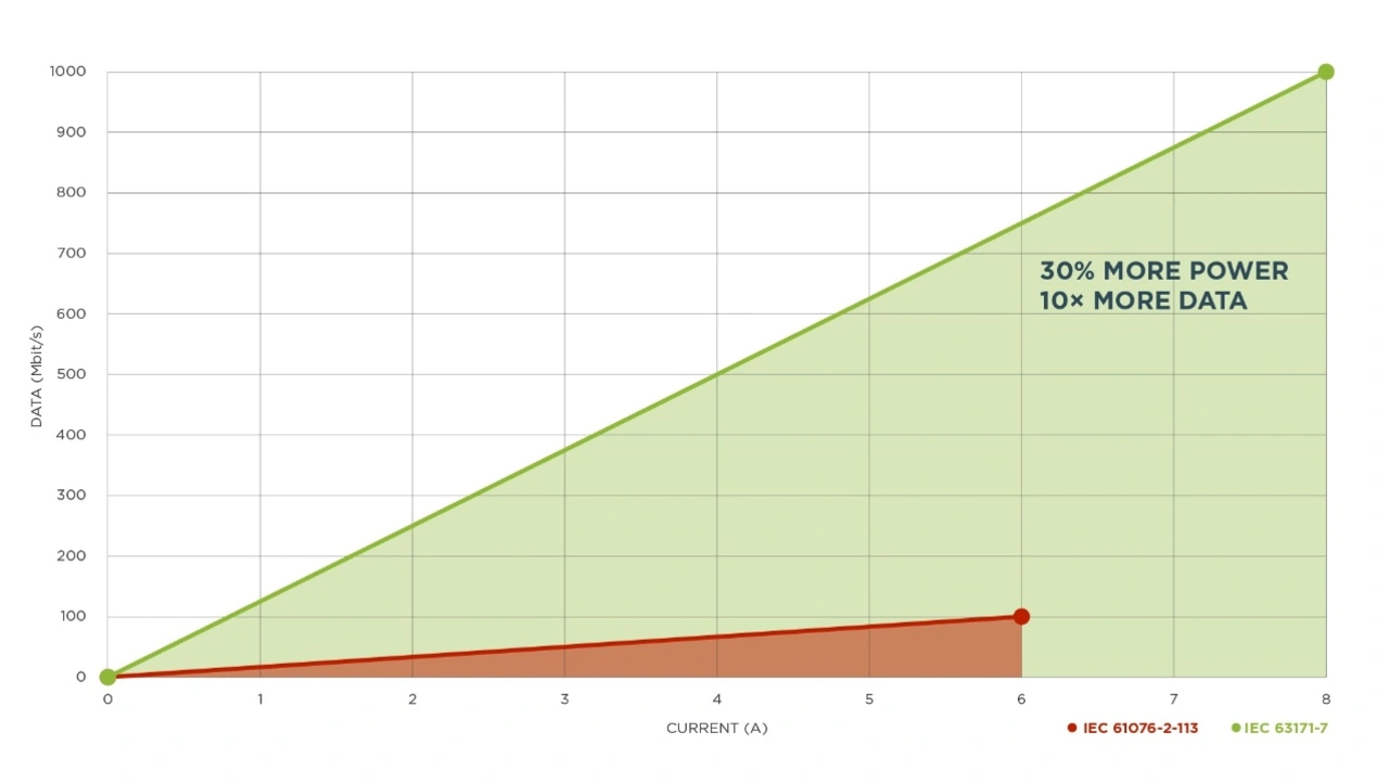 Konventionelle M12-Stecker haben Einschränkungen bei der Strom- und Datenübertragung. Bestehende Hybridsteckverbinder, die der Norm IEC 61076-2-113 entsprechen, liefern nur 2 x 6 A und 100 Mbit/s, was den Einsatz von Hochleistungsgeräten und den schnellen Datenaustausch einschränkt. Daraus ergeben sich Schwierigkeiten, die Anforderungen von Industrie 4.0 zu erfüllen. Diese Barrieren sollen durch die Norm IEC 63171-7 Edition 2 und entsprechende Produkte überwunden werden, die bestehende SPE-Standards auf das M12-Hybrid-Format ausweiten.